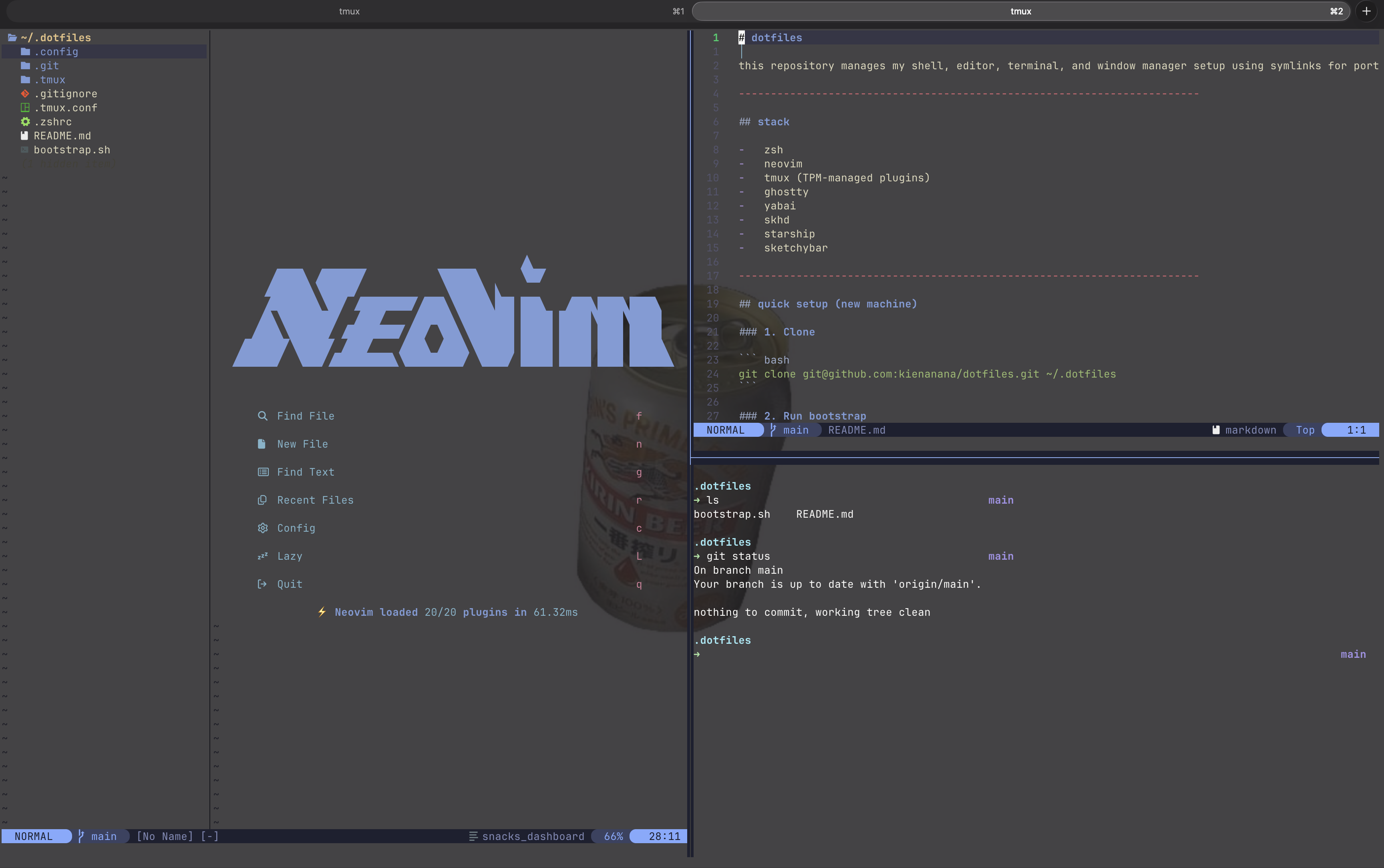 tmux is a terminal multiplexer that lets me manage multiple terminal sessions, split windows into panes, and keep sessions running in the background. really cool stuff.