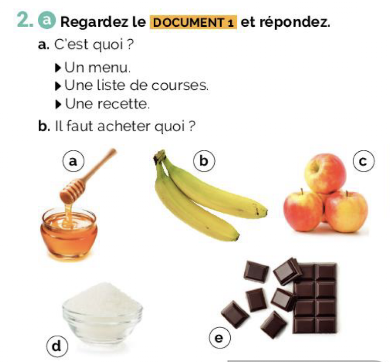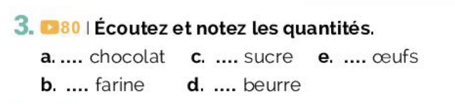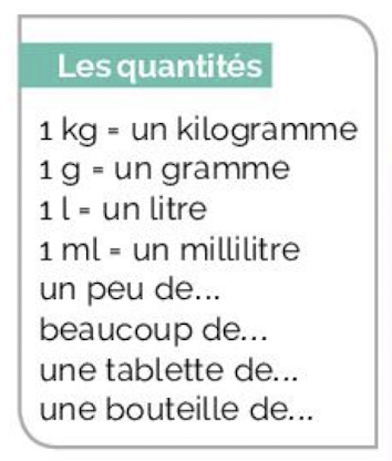 Pour faire un gâteau: a. une tablette de chocolate b. deux cuillère à soupe de farine c. cent vingt-cinq grammes de sucre d. cent vingt-cinq grammes de beurre e. trois œufs