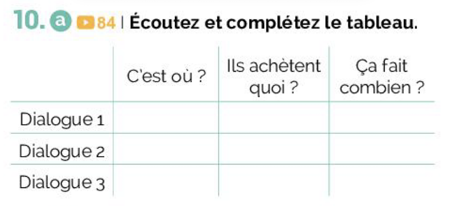 Dialogue 2: Nous somme à la boulangerie Une baguette et deux croissants 3 euros 10 cents