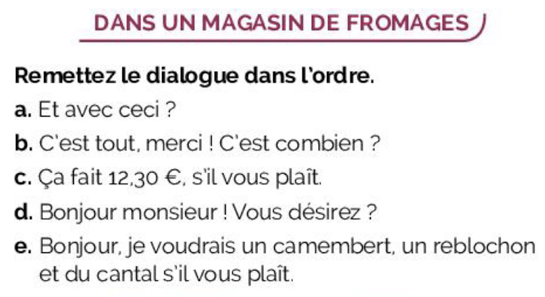 - Bonjour, je voudrais un camembert, un reblochon et du cantal s’il vous plaît