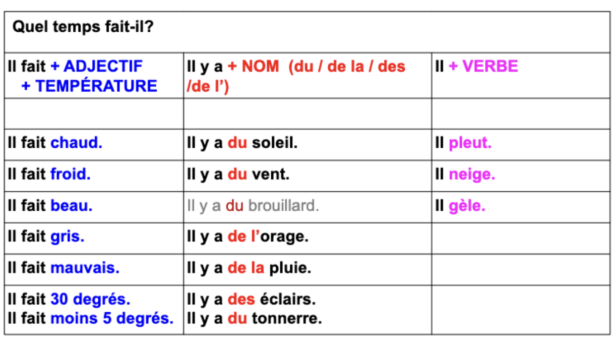 - il fait quel temps ? / Quel temps fait-il ? / il fait ?: what is the weather !