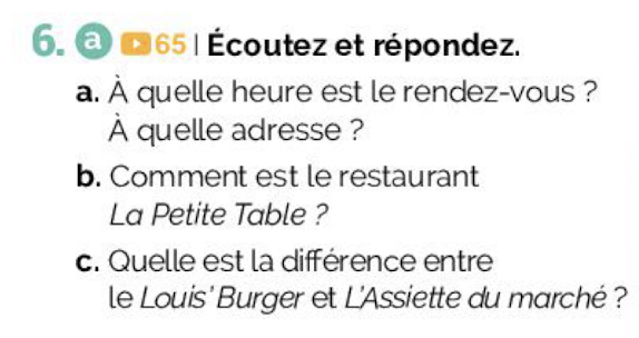 a. Le rendez-vous est à vingt heures. quarante-deux rue de la Monnaie b. Le restaurant La Petite Table est délicieux c. Le Louis’Burger est un restaurant de fast-food, L’Assiette du Marché est un restaurant gastronomique.