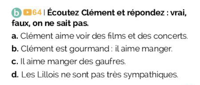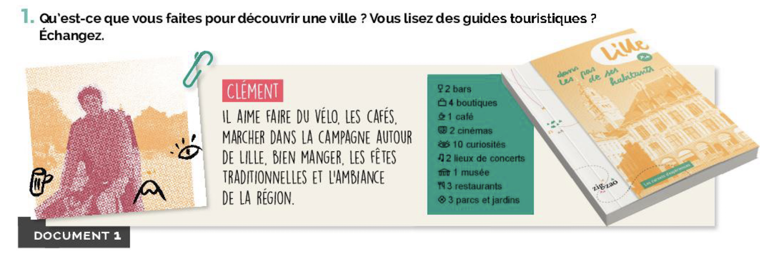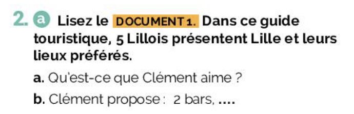 a. Clément aime faire du vélo et il aime les cafés. Il aime marcher dans la campagne. Il aime manger. Il aime les fêtes et l’ambiance de la région. b. Clément propose deux bars, quatre boutiques, un café, deux cinémas, dix curiosités (don’t pronounce the x, if consonant after), deux lieux de concerts, un musée, trois restaurants, et trois parcs et jardins.
