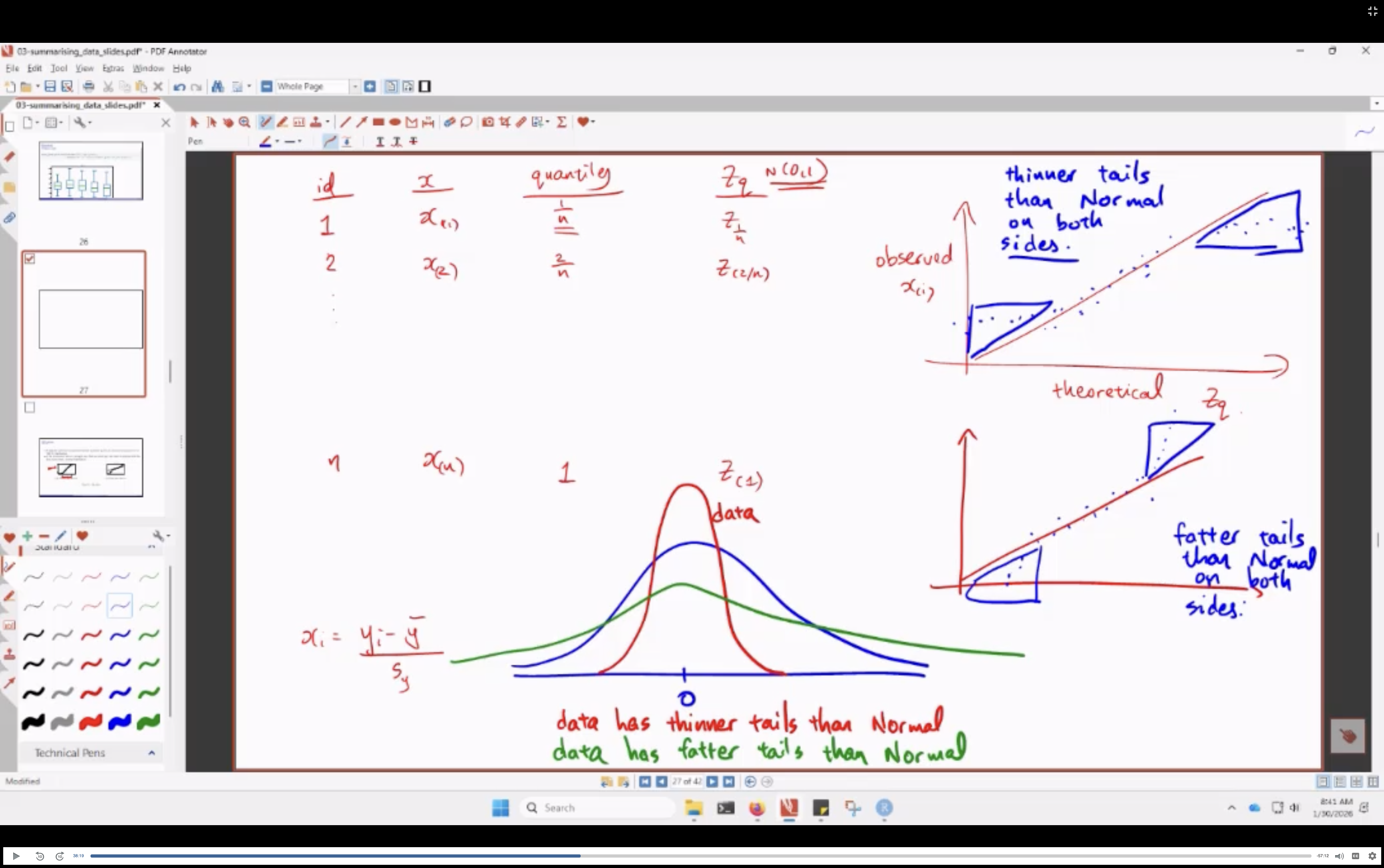 a QQ-plot plots the standardised sample quantiles against the theoretical quantiles of a N(0,1) distribution. if the points fall on a straight line, then we say there is evidence that the data comes from a Normal distribution.