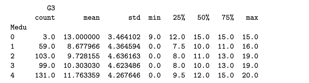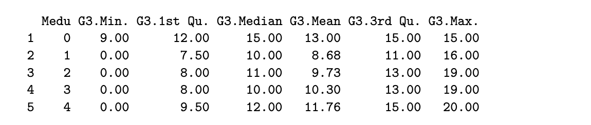 round(aggregate(G3 ~ Medu, data=stud_perf, FUN=summary), 2)
