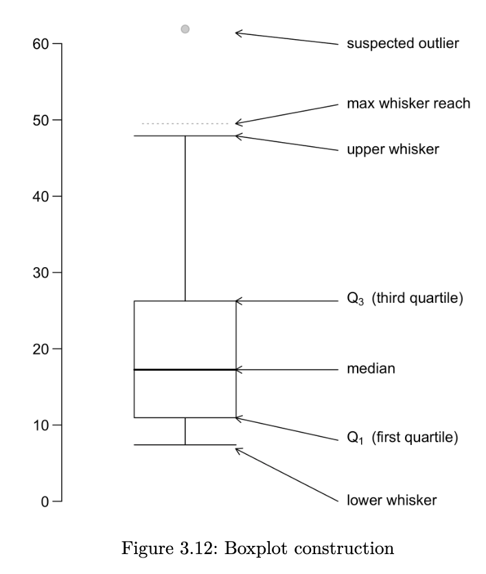 - determine the max-whisker reach: Q3 + 1.5 x IQR; the min-whisker reach by Q1 - 1.5 x IQR