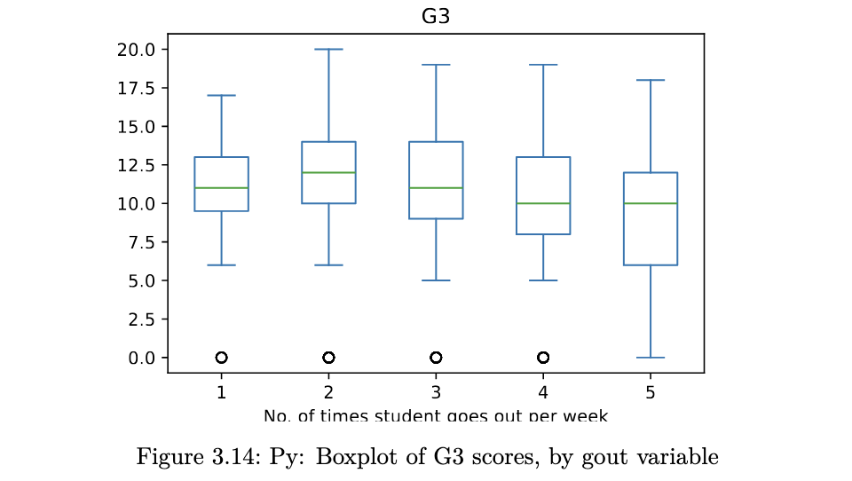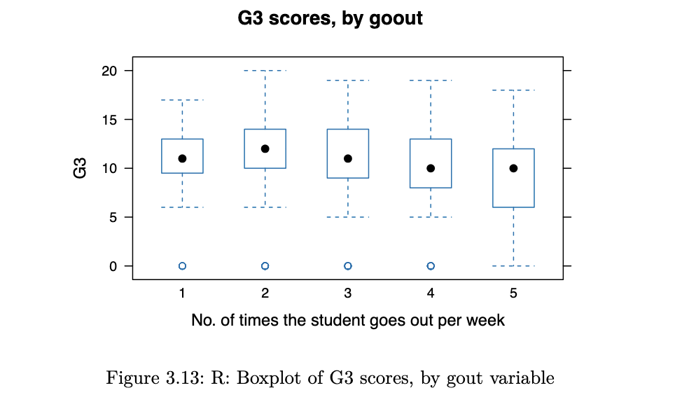 bwplot(G3 ~ goout, horizontal = FALSE, main="G3 scores, by goout",