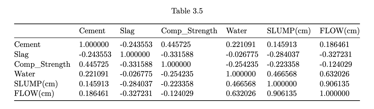 col_to_use <- c("Cement", "Slag", "Comp.Strength", "Water", "SLUMP.cm.", "FLOW.cm.")