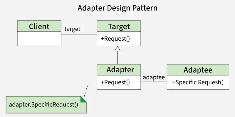 - Adapter acts as a bridge: it implements the Target interface (Request()), but inside, it calls the Adaptee’s SpecificRequest().